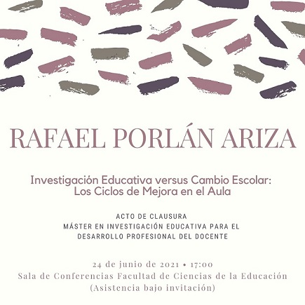 17:15 a 18:15h. Conferencia de clausura del Profesor Dr. Rafael Porlán, de título: Investigación Educativa versus Cambio Escolar: Los Ciclos de Mejora en el Aula.